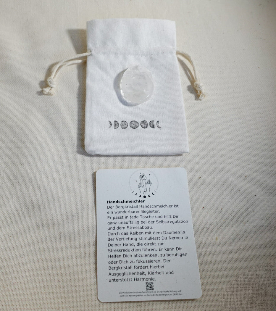 Der Handschmeichler kommt in einen mit Liebe handbedruckten Baumwollsäckchen zu Dir und beinhaltet noch eine Karte mit Beschreibung wie Du Deinen Stein auf- und entladen kannst auf deutsch.
