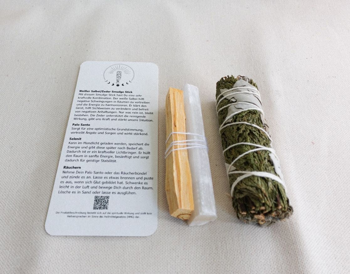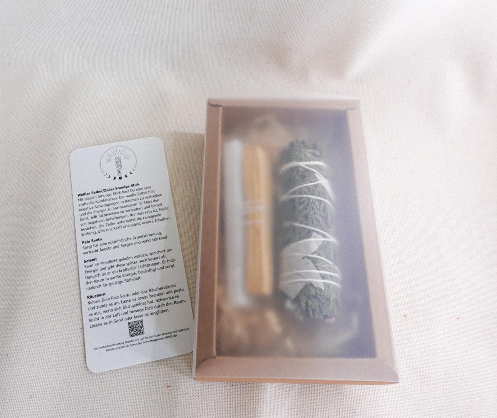 Ein mit Liebe zusammengestelltes Räucher Set aus einem weißen Salbei/Zedern Stick, einem Palo Santo und einem Selenitstab. Zusammengepackt in einer schönen Kraftpapier Schiebebox, handbedruckt mit Mondphasen. Zusätzlich beinhaltet es eine kleine liebevolle Karte mit Beschreibung. Ein wunderbares Geschenk für einen Herzensmenschen oder wenn Du Dir selbst eine Freude machen möchtest.